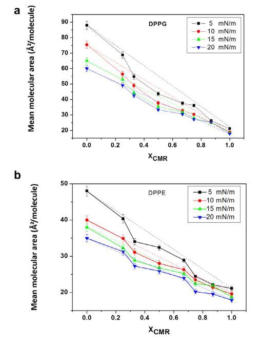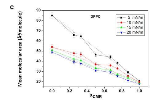 純和混合單層的 pA 等溫線與分子面積的關(guān)系如圖 1 所示。CMR/DPPG 等溫線顯示出與純 DPPG 脂質(zhì)相似的趨勢(圖 1a)。 相似相 對所有 CMR/DPPG 混合物都觀察到了轉(zhuǎn)變。 DPPG 和 DPPC 顯示崩潰壓力 (DPcoll) 為 52 mN.m-1 次方和 60 mN.m-1次方 , 分別。 一個(gè)過渡 (p ffi 3 mN.m-1次方 ) 從液體 發(fā)現(xiàn)純 DPPE 單層膨脹為凝聚相 與 D. coll 在 ffi55 mN.m-1次方 . 為 D. coll 獲得的值 純脂質(zhì)與文獻(xiàn)一致(Vollhardt 等人, 2000; 諾沃塔斯卡等人,2014 年)。