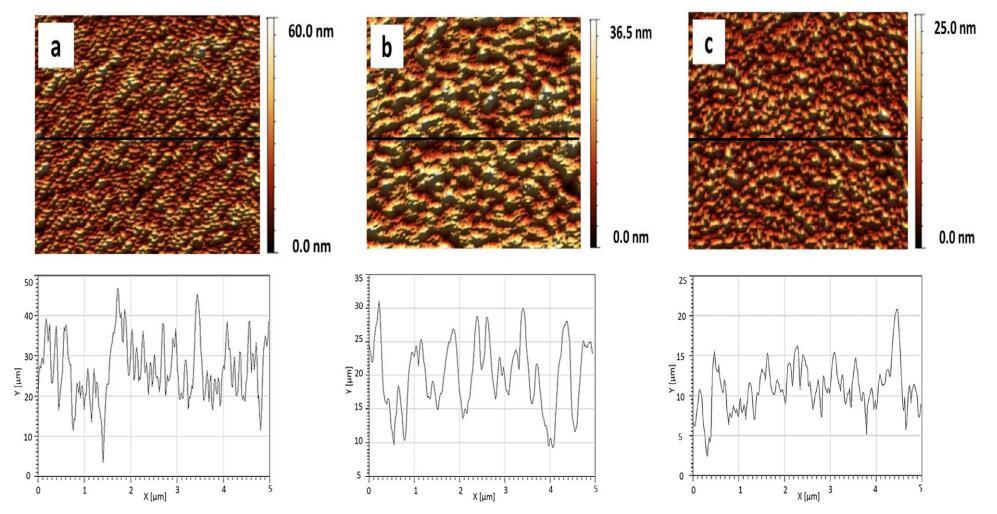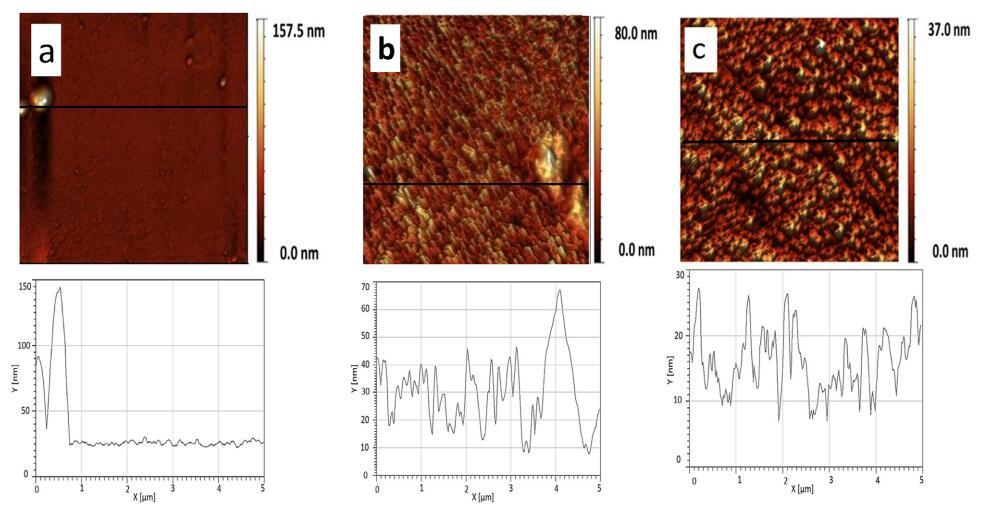 圖 9 顯示了純磷脂單層的 AFM 圖像 在 p = 20 mN/m 時(shí)轉(zhuǎn)移。 純磷脂顯示出均勻的 均方根 (rms) 等于 0.219 nm 的圖案, DPPG、DPPE 和 DPPC 分別為 0.060 nm 和 0.054 nm (圖 9)。 我們獲得了 rms ~ 0.045 nm (XCMR = 0.87) 相當(dāng)于 光滑的單層形貌(圖 10a)。 另一方面, CMR/DPPE 和 CMR/DPPC 薄膜對應(yīng)于粗糙表面 rms 分別為 0.1754 nm 和 0.072 nm(圖 10b 和 c)。 測量重復(fù)三次,rms 的標(biāo)準(zhǔn)偏差約為 5%。