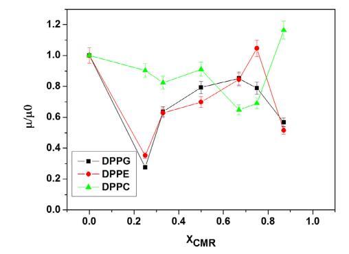 作為函數(shù)分子面積 (ΔVA) 的表面電位為 如圖3a所示。 為所有研究的磷脂獲得的 ?V 值 與之前的報(bào)告相似(Andrade et al., 2006; Nowotarska 等,2014)。 ?V(460 mV 至 275 mV)逐漸降低 對于 DPPG,觀察到 CMR 摩爾分?jǐn)?shù)的函數(shù)。 ?V 易受極性和非極性基團(tuán)的取向影響。