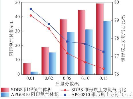 表面活性劑泡沫對氮氣緩釋作用結(jié)果如圖11所示。相同質(zhì)量分?jǐn)?shù)下,SDBS溶液對氮氣的緩釋效應(yīng)優(yōu)于APG0810,質(zhì)量分?jǐn)?shù)為0.15%時,SDBS和APG0810溶液泡沫阻礙氮氣體積分別為49.102 mL和37.042 mL。