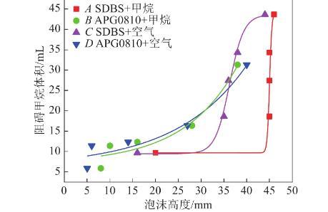 4)泡沫穩(wěn)定性是決定甲烷緩釋效應(yīng)的關(guān)鍵因素,泡沫穩(wěn)定性越強,越能有效控制甲烷流動??芍苯硬扇】諝?表面活性劑泡沫的各項參數(shù)表示泡沫性質(zhì)。陰離子表面活性劑SDBS表現(xiàn)較好,泡沫穩(wěn)定性較強,隨著時間推移,SDBS也有比APG0810更好控制甲烷釋放的效果。質(zhì)量分?jǐn)?shù)為0.15%時,10 min內(nèi)SDBS可以控制約占總通入甲烷體積87%的甲烷。120 min后仍可控制約占通入總體積49.16%的甲烷。