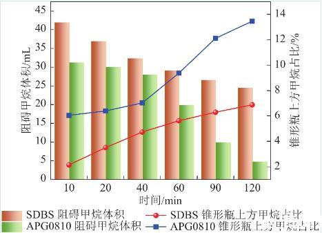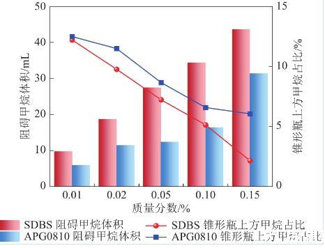 通過式(4)計算得到泡沫中注入氣體含量。圖10中柱狀圖可以看出,SDBS溶液泡沫對甲烷的束縛效果明顯優(yōu)于APG0810,APG0810溶液由于發(fā)泡性及泡沫穩(wěn)定性均弱于SDBS,故對甲烷束縛能力較差。質(zhì)量分?jǐn)?shù)為0.05%的SDBS可控制27.43 mL甲烷,0.15%的SDBS可控制43.649 mL甲烷,占總注入甲烷體積87%。質(zhì)量分?jǐn)?shù)為0.15%的APG0810溶液可控制31.33 mL甲烷,占總注入甲烷體積62.6%。
