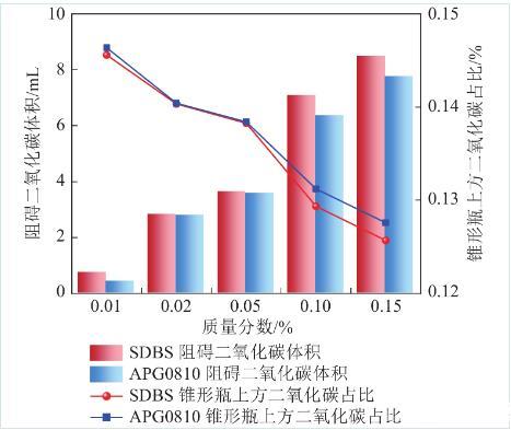 圖12為注入二氧化碳的氣相色譜檢測結(jié)果,計算出表面活性劑泡沫對二氧化碳的緩釋作用結(jié)果如圖12柱狀圖所示。相同質(zhì)量分?jǐn)?shù)下,SDBS溶液對二氧化碳的緩釋效應(yīng)優(yōu)于APG0810。然而兩種表面活性劑對二氧化碳緩釋效應(yīng)均不顯著,SDBS表面活性劑溶液在質(zhì)量分?jǐn)?shù)最大時10 min內(nèi)只控制了8.46 mL二氧化碳氣體,APG0810只控制了7.74 mL二氧化碳氣體。