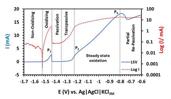 圖1電化學(xué)線性掃描伏安圖(LSV,藍(lán)色實線)及液滴電流的對數(shù)圖(紅色虛線),針對1 M NaOH中的鎵銦合金,掃描速率為0.5 mV/s。垂直虛線將圖中標(biāo)記的六個反應(yīng)區(qū)域區(qū)分開來,標(biāo)記出三個氧化峰P1、P2和P3。