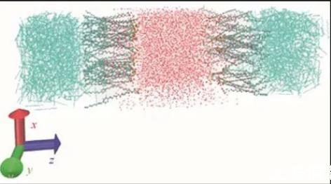 在進(jìn)行分子動力學(xué)模擬之前構(gòu)建出合理的力場是極為重要的工作。本文通過Autom-ated Topology Builder(ATB)and repository生成的GROMOS系列力場參數(shù),利用現(xiàn)有的數(shù)據(jù)庫以及量子化學(xué)進(jìn)行計算,同時它可以充分考慮到分子中的對稱結(jié)構(gòu),使其反映出的分子性質(zhì)及參數(shù)更為精確。但ATB只能處理原子數(shù)小于40的分子,對于分子數(shù)大于40的分子結(jié)構(gòu)需進(jìn)行拆分。在獲取準(zhǔn)確的電荷及鍵參數(shù)之后利用packmol程序定向排列分子將其堆砌成立方體結(jié)構(gòu)。此外,本文選取的油-水界面需使表面活性劑平均分布在水相兩側(cè),親水基靠近水相,疏水基靠向油相。圖2為初始狀態(tài)下體系截圖,其中中間紅色部分為水分子,左右兩側(cè)藍(lán)色部分為癸烷分子,油水中間即OPES分子。