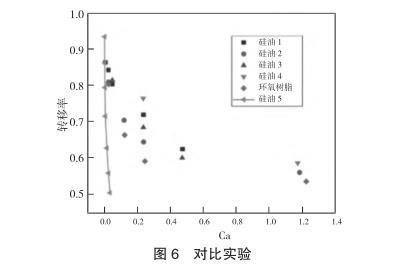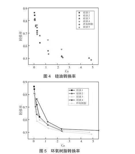 對不同黏度以及拉伸速度下的膠液進行測量并計算轉移率,如圖4所示,在忽略慣性力的條件下,采用無量綱數(shù)Ca來表示轉移率,對于表面張力相似且不同黏度的四種甲基硅油的轉移率有著相似的收斂情況。為了進一步印證Ca對轉換率的影響,引入與甲基硅油不同表面張力的環(huán)氧樹脂進行對比實驗,如圖5所示,表面張力較大的環(huán)氧樹脂的轉換率會比甲基硅油小,但整體趨勢相差不大,均會收斂到一定數(shù)值。之后,為了了解慣性力對轉移率的影響,選擇黏度較小的膠液進行實驗,同時加大移液針直徑使其脫離微量點膠的范圍,以提高慣性力對膠液傳遞的影響,如圖6所示,在通過增加膠液體積以提高慣性力影響的實驗中,膠液轉移率的變化與之前有極大差異。