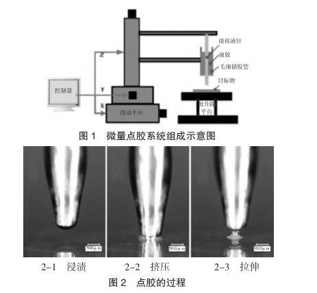 本課題組研制了一種基于移液針轉印原理的微量點膠系統(tǒng),該點膠系統(tǒng)所形成的膠斑直徑可達到數(shù)十微米,膠滴體積可達飛升-皮升的范圍。該系統(tǒng)的結構如圖1所示。該系統(tǒng)由出膠單元、驅動單元和控制單元組成。其中,出膠單元為系統(tǒng)的核心,其主要包含微移液針和毛細儲膠管兩個關鍵元件,移液針通過在儲膠管內的上下往復運動,實現(xiàn)膠液向基板的微量轉移。驅動單元由X/Y/Z三個方向的驅動電機和微升降平臺組成,用于驅動微移液針及點膠工件的運動。控制單元由PLC控制系統(tǒng)和LaBview開發(fā)的控制面板組成,實現(xiàn)對電機運動的自動控制。