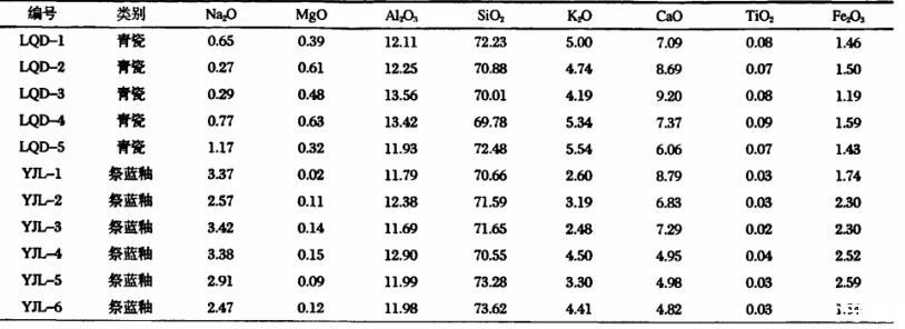 表2宋代龍泉青瓷釉和元代景德鎮(zhèn)元代祭藍(lán)釉的主、次量元素組成