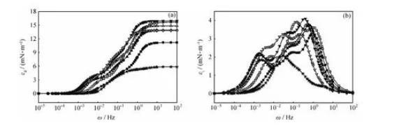 當(dāng)頻率較低時(shí),界面張力梯度在實(shí)驗(yàn)時(shí)間內(nèi)幾乎可以完全消除,由于界面形變所造成的能量變化幾乎完全耗散在環(huán)境中,對(duì)擴(kuò)張模量的貢獻(xiàn)可以忽略,εi接近于零;當(dāng)頻率較高時(shí),各種弛豫過(guò)程來(lái)不及發(fā)生,對(duì)擴(kuò)張模量的影響也可以忽略,εi仍然接近于零;只有在適宜的頻率范圍內(nèi),εi隨頻率變化而變化,并在其弛豫過(guò)程的特征頻率處出現(xiàn)極大值。