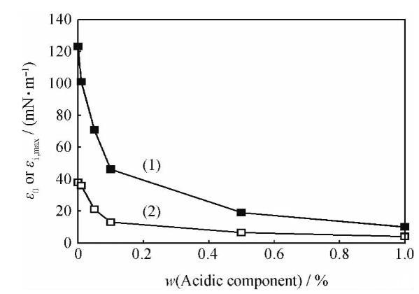 圖6含不同量酸性組分的煤油-1750mg/L HMPAM水溶液體系的極限擴(kuò)張彈性(ε0)和擴(kuò)張黏性最大峰值(εi,max)