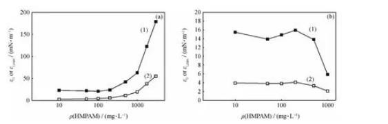 (2)在油-水體系中,原油酸性組分分子與HMPAM分子的疏水部分相互作用,阻礙界面網(wǎng)絡(luò)結(jié)構(gòu)的形成,大大降低了界面膜的擴(kuò)張彈性和擴(kuò)張黏性。