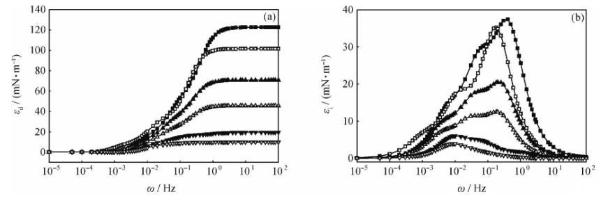 圖5含不同量酸性組分的煤油-1750mg/L HMPAM水溶液體系的界面擴(kuò)張彈性(εd)和擴(kuò)張黏性(εi)全頻率譜