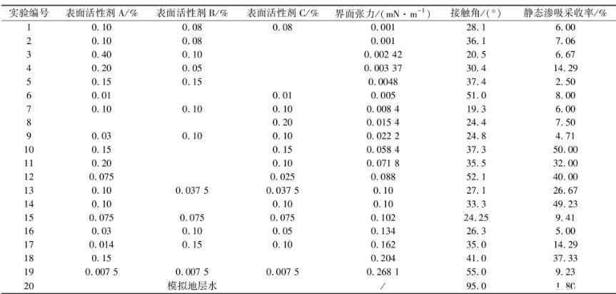 根據(jù)國內(nèi)外學(xué)者的研究,滲吸液對滲吸的影響主要是改變油水界面張力、潤濕性、乳化性和pH值。乳化性主要是通過乳化分散,從而增強(qiáng)油滴在巖心孔道內(nèi)的流動能力;pH值則主要是影響滲吸液的乳化能力。本次實(shí)驗(yàn)采取靜態(tài)滲吸的方式,乳化性的作用相對較小,故滲吸液配制指標(biāo)為界面張力與潤濕性。