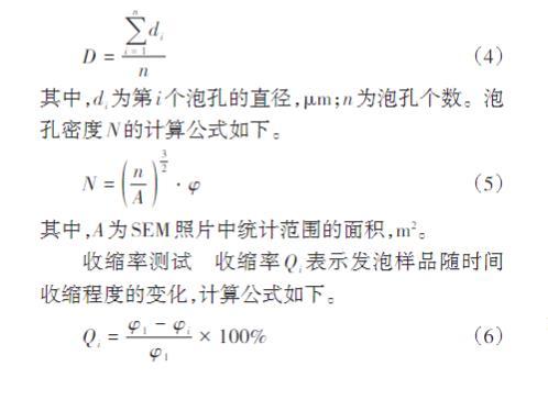 其中,A為SEM照片中統(tǒng)計范圍的面積,m2。收縮率測試收縮率Qi表示發(fā)泡樣品隨時間收縮程度的變化,計算公式如下。