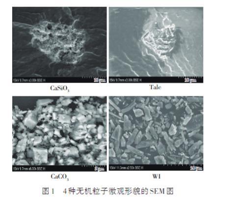 4種無機粒子的表觀形貌如圖1所示,可以看出,CaSiO3顆粒為多孔蜂窩狀結構,Talc顆粒形狀為偏平形,CaCO3顆粒形狀不規(guī)則,WI多為針狀形顆粒。