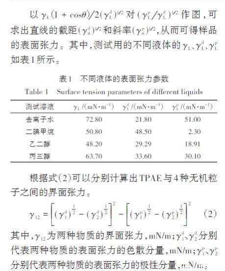 根據(jù)式(2)可以分別計算出TPAE與4種無機粒子之間的界面張力。
