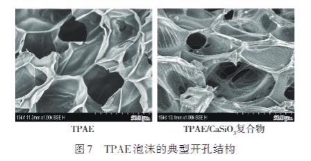 根據(jù)TPAE/無機粒子復(fù)合物泡沫的泡孔結(jié)構(gòu)圖可以看出,相比較于純TPAE泡沫的閉孔結(jié)構(gòu),無機粒子的添加明顯促進了TPAE泡沫泡孔的打開。為詳細(xì)探究無機粒子的開孔機制,使用真密度儀對不同TPAE/無機粒子復(fù)合物泡沫的開孔率進行了測試,如圖6所示。無機粒子的添加都提高了TPAE泡沫的開孔率,表明無機粒子的加入是影響開孔率的關(guān)鍵因素?;赥PAE和TPAE/CaSiO3復(fù)合物泡沫中的開孔結(jié)構(gòu)分析無機粒子對復(fù)合物泡沫開孔結(jié)構(gòu)的影響(以CaSiO3為例),如圖7所示??梢钥闯?,純TPAE泡沫主要出現(xiàn)泡孔壁上,且形成的孔比較規(guī)則,這是由于純TPAE熔體強度低,泡孔壁容易破裂。而TPAE/CaSiO3復(fù)合物泡沫的開孔主要發(fā)生在泡孔的內(nèi)壁以及幾個泡孔的相交處上,這是因為在泡孔生長過程中,由于CaSiO3的非均相成核,泡孔在CaSiO3分散相周圍成核生長,形成花狀的泡孔結(jié)構(gòu),而TPAE與無機粒子的相容性差,使得CaSiO3從泡孔壁上脫落,留下不規(guī)則的網(wǎng)狀結(jié)構(gòu),從而導(dǎo)致泡孔間相互連接。其他3種TPAE/無機粒子復(fù)合物泡沫的開孔形式同TPAE/CaSiO3復(fù)合物泡沫一致。圖8展示了兩種與TPAE具有不同界面張力的粒子(以CaSiO3和Talc為例)的添加對復(fù)合物泡沫開孔結(jié)構(gòu)形成的影響機制。