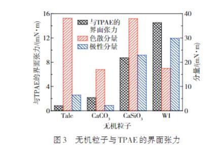 為深入評估4種無機粒子與TPAE之間的相容性,本研究采用界面張力儀、接觸角儀計算了4種無機粒子與TPAE之間的界面張力,以定量分析其相容性。如圖3所示,可以看出,Talc與TPAE之間的界面張力為0.82 mN/m,表明二者相互作用力較強,能夠更好地相互滲透和混合,反映出二者之間存在良好的相容性。