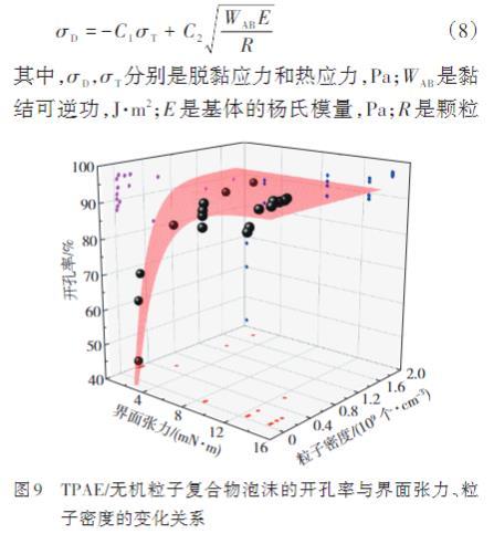 式(8)揭示了起始脫黏應(yīng)力受到粒子與基體間黏接強(qiáng)度(即界面張力)、楊氏模量以及顆粒尺寸的共同影響。隨著顆粒尺寸和界面張力的增加,脫黏所需的起始應(yīng)力降低,導(dǎo)致由顆粒脫黏引發(fā)的空隙會(huì)隨著更高的泡孔壁的拉伸變形速率而增加。對于TPAE/CaCO3、TPAE/CaSiO3及TPAE/WI這3種復(fù)合物,由于其較高的界面張力或較大的粒子直徑,促使分散相從TPAE基體中的脫落更為容易,較高的粒子密度導(dǎo)致異相成核位點(diǎn)增多,進(jìn)而顯著提升泡孔密度和減少泡孔壁厚,泡沫生長過程中拉伸應(yīng)變速率的提高使泡孔壁所承受的拉伸應(yīng)力增大,從而導(dǎo)致復(fù)合物泡沫的開孔率進(jìn)一步增加。其中,TPAE/WI復(fù)合物因在界面張力以及粒子分布密度上的雙重優(yōu)勢而具有最高的開孔率。