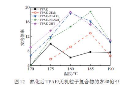 圖12展示了4種TPAE/無機(jī)粒子泡沫熟化后的發(fā)泡倍率隨溫度變化的情況。結(jié)果表明,相較于純TPAE,4種復(fù)合物泡沫的最終發(fā)泡倍率均有所增加,其中TPAE/CaCO3、TPAE/CaSiO3及TPAE/WI顯著提升。已知影響發(fā)泡倍率的主要因素有發(fā)泡劑的溶解度和聚合物的流變性能。由于無機(jī)粒子的添加量較少,基本不會(huì)影響CO2在復(fù)合物中的溶解度及流變性能。因此TPAE/無機(jī)粒子復(fù)合物的初始發(fā)泡倍率與純TPAE基本一致,但無機(jī)粒子的添加會(huì)促進(jìn)TPAE形成開孔結(jié)構(gòu),尤其是CaCO3、CaSiO3以及WI可使TPAE形成高開孔率的泡沫,減小了泡沫的收縮,使得完全熟化后的發(fā)泡倍率遠(yuǎn)高于TPAE,大大提高了TPAE的發(fā)泡性能。
