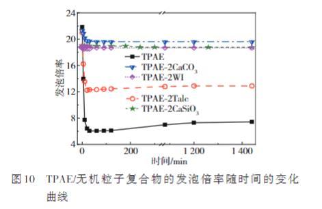 圖10 TPAE/無機(jī)粒子復(fù)合物的發(fā)泡倍率隨時(shí)間的變化曲線