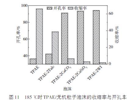 圖11 185℃時(shí)TPAE/無機(jī)粒子泡沫的收縮率與開孔率
