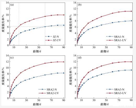 暴露在強(qiáng)紫外線輻射環(huán)境中的各組試樣的質(zhì)量損失率均明顯大于標(biāo)準(zhǔn)干燥環(huán)境中試樣的質(zhì)量損失率。在3~21 d齡期內(nèi),各組試樣在強(qiáng)紫外線輻射環(huán)境中的質(zhì)量損失增長(zhǎng)速率明顯大于其在標(biāo)準(zhǔn)干燥環(huán)境中的質(zhì)量損失增長(zhǎng)速率。以基準(zhǔn)組(JZ)為例,強(qiáng)紫外線輻射環(huán)境下水泥石在18 d齡期時(shí)的質(zhì)量損失率達(dá)到標(biāo)準(zhǔn)干燥環(huán)境下水泥石在60 d齡期時(shí)的質(zhì)量損失率(穩(wěn)定值),并最終在90 d齡期時(shí),JZ-UV組的質(zhì)量損失率達(dá)到了JZ-N組的1.5倍。這是強(qiáng)紫外線輻射的“光化學(xué)作用”引起的。當(dāng)水分子吸收光子后,內(nèi)部的電子會(huì)發(fā)生能級(jí)躍遷,形成不穩(wěn)定的激發(fā)態(tài),并發(fā)生離解反應(yīng),使H—O鍵斷裂生成H+和HO-,從而加速水分子的運(yùn)動(dòng),促進(jìn)了水泥石表面的干燥,增大了水泥石體系內(nèi)部與外部環(huán)境的濕度梯度,導(dǎo)致水泥石中的水分快速散失。