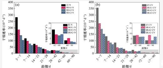 比較2種環(huán)境下各組試樣的干縮變形變化規(guī)律,發(fā)現(xiàn)基準(zhǔn)組與SRA試驗(yàn)組呈現(xiàn)出不一樣的變化趨勢(shì)。由圖4可知,在強(qiáng)紫外線輻射環(huán)境下,基準(zhǔn)組(JZ)在3~21 d齡期內(nèi)的干縮速率遠(yuǎn)高于其在標(biāo)準(zhǔn)干燥環(huán)境下的干縮速率,最終表現(xiàn)為JZ組在強(qiáng)紫外線輻射環(huán)境下的干縮變形增加,說明在溫度和濕度一致的條件下,強(qiáng)紫外線輻射會(huì)增大水泥石的干縮變形。