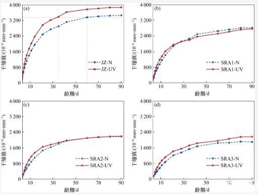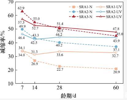 從圖3中可以觀察到,隨著齡期的延長(zhǎng),干縮曲線SRA2-UV逐漸接近于干縮曲線SRA3-UV,而SRA3-UV的干縮值沒有進(jìn)一步降低。這表明上述分析是合理的。在強(qiáng)紫外線輻射下,當(dāng)減縮劑的摻量超過3%時(shí),其孔隙溶液中的SRA濃度超過臨界濃度(CMC),進(jìn)一步增大摻量不能增強(qiáng)SRA在該應(yīng)用環(huán)境中的減縮效果。