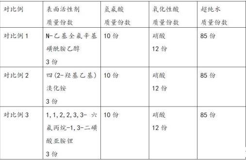 基于表3可以看出,對比例1和實施例1的區(qū)別僅在于兩親性離子液體不同,其中,對比例1采用常規(guī)的N-乙基全氟辛基磺酰胺乙醇作為表面活性劑,導致表面張力增加,蝕刻選擇比降低。對比例2未加入1,1,2,2,3,3-六氟丙烷-1,3-二磺酸亞胺鋰,無法調(diào)節(jié)蝕刻速率。對比例3單獨采用1,1,2,2,3,3-六氟丙烷-1,3-二磺酸亞胺鋰作為表面活性劑,導致表面張力增加,蝕刻選擇比降低,而本發(fā)明合成的離子液體同時具有多氟基團、環(huán)狀結(jié)構(gòu)、多羥基,能夠顯著降低表面張力,同時提高蝕刻選擇比。