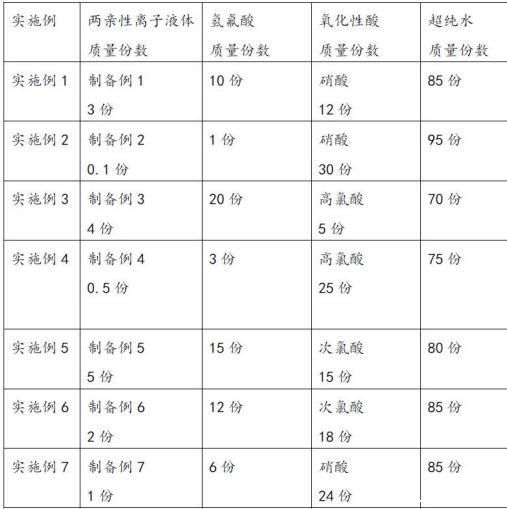 多晶硅蝕刻液實施例1-7包含的組分及摩爾比如表1所示,多晶硅蝕刻液對比例1-3包含的組分及摩爾比如表2所示。按照下表1和表2分別稱取各自用量的各個組分,然后將超純水、氫氟酸、氧化性酸、兩親性離子液體依次加入容器內(nèi),充分攪拌溶解,最后采用0.5μm濾芯過濾,即得所述多晶硅蝕刻液。