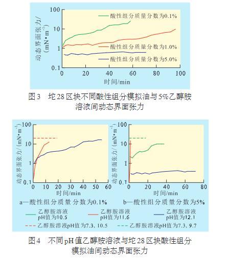 ZhangL等曾對(duì)勝利油區(qū)孤東油田外輸油中的酸性組分按相對(duì)分子質(zhì)量和極性細(xì)分,研究發(fā)現(xiàn):對(duì)于相對(duì)分子質(zhì)量較低的脂肪酸,弱堿條件下就能夠發(fā)生反應(yīng),大幅度降低界面張力瞬時(shí)值,但穩(wěn)態(tài)值較高,動(dòng)態(tài)界面張力曲線呈“V”型,油酸模擬油的動(dòng)態(tài)界面張力特性就是典型代表;而對(duì)于相對(duì)分子質(zhì)量較高、含稠環(huán)的芳香酸,則只能與強(qiáng)堿發(fā)生反應(yīng),生成的芳香酸皂水溶性較弱,傾向于吸附在界面上,因此,動(dòng)態(tài)界面張力不再出現(xiàn)極小值。坨28區(qū)塊原油的酸性組分是混合酸,其中不同結(jié)構(gòu)的石油酸可能在不同pH值條件下分別起主導(dǎo)作用:低質(zhì)量分?jǐn)?shù)的乙醇胺溶液主要與低相對(duì)分子質(zhì)量的脂肪酸作用,而高質(zhì)量分?jǐn)?shù)的乙醇胺溶液主要與高相對(duì)分子質(zhì)量的芳香酸作用。