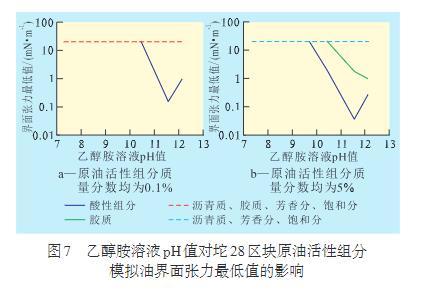 從乙醇胺溶液的pH值對(duì)不同質(zhì)量分?jǐn)?shù)坨28區(qū)塊原油活性組分模擬油界面張力最低值的影響(圖7)可看出,當(dāng)活性組分質(zhì)量分?jǐn)?shù)為0.1%時(shí),只有酸性組分與有機(jī)堿發(fā)生作用;當(dāng)質(zhì)量分?jǐn)?shù)增大至5%時(shí),膠質(zhì)組分開(kāi)始作用,而瀝青質(zhì)界面張力依舊較高。這可能是由于坨28區(qū)塊原油瀝青質(zhì)中酸性組分含量過(guò)少造成的。因此,對(duì)于坨28區(qū)塊原油,與乙醇胺作用的難易順序?yàn)椋核嵝越M分最強(qiáng),膠質(zhì)次之,瀝青質(zhì)、飽和分和芳香分與之作用比較微弱。