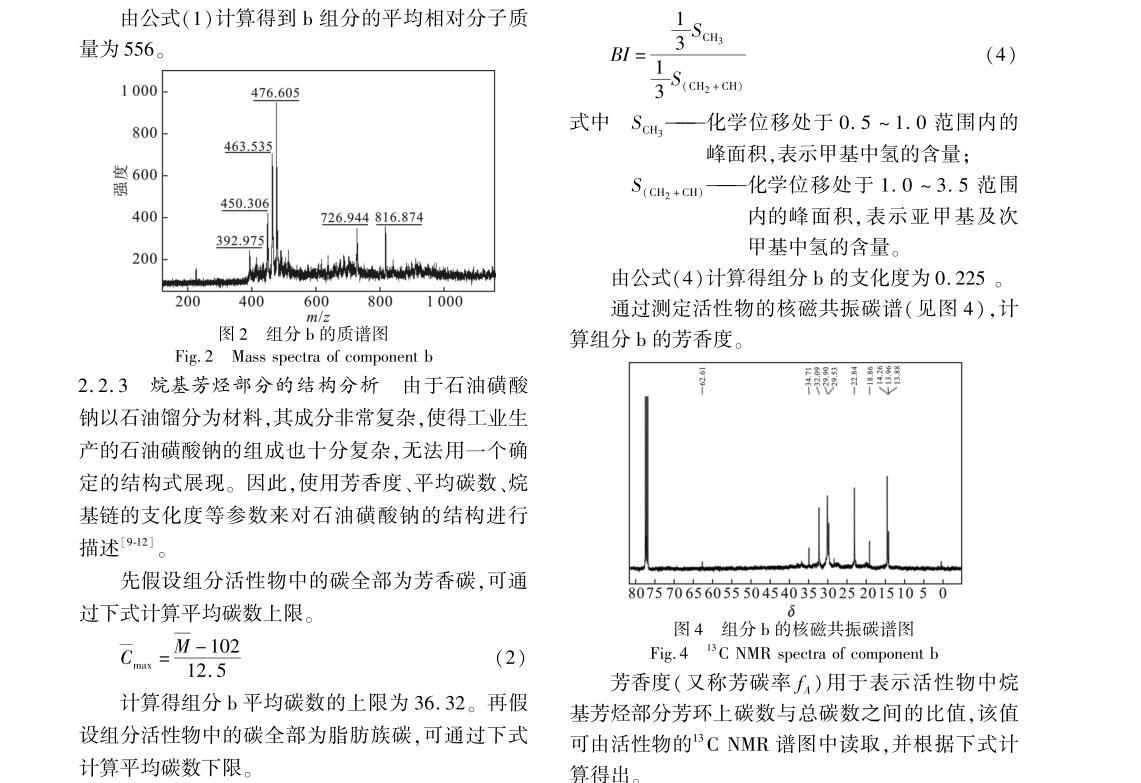 由上可知,只有組分b的界面張力達到超低,說明石油磺酸鹽中主要起作用的物質(zhì)集中在組分b中,因此對組分b采用紅外光譜、質(zhì)譜、核磁共振等方法測定其結(jié)構,并通過理論計算與實驗數(shù)據(jù)相結(jié)合,推斷組分b的大致分子結(jié)構。
