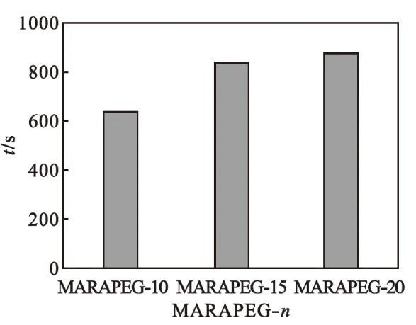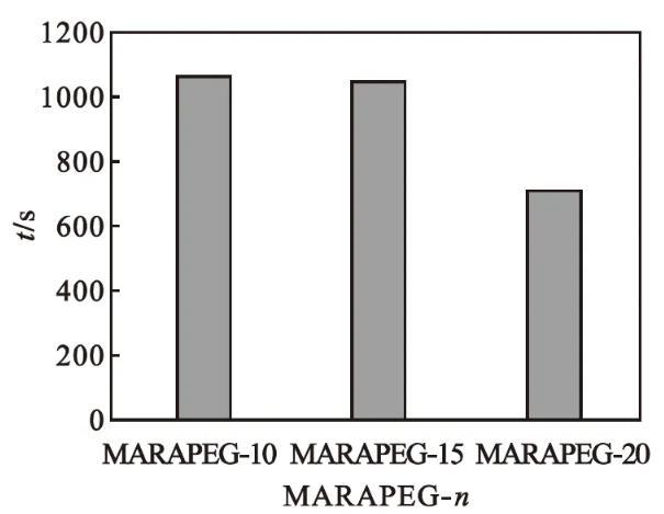 馬來酰蓖麻油酸聚乙二醇(n=10、15、20)酯的潤濕性能如圖5所示。由圖5可知:產(chǎn)品的潤濕時間隨著聚乙二醇聚合度的增大而增長。氧乙基數(shù)增加,其親水性增強,降低表面張力的能力減弱,潤濕性能減弱。