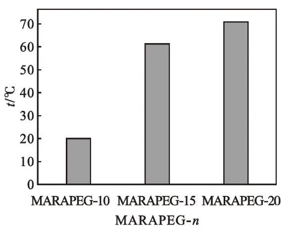 馬來酰蓖麻油酸聚乙二醇(n=10、15、20)酯的濁點如圖6所示。由圖6可知:產(chǎn)物的濁點范圍為20——71℃。隨著聚乙二醇聚合度的增加,產(chǎn)品的濁點逐漸升高。聚乙二醇聚合度越大,聚乙二醇醚鍵中的氧原子與水中氫原子形成的氫鍵越多,產(chǎn)品在水中的溶解性能越好。