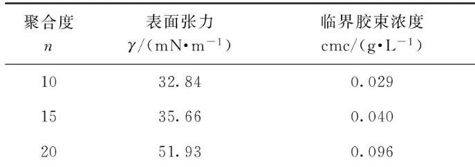 (2)聚乙二醇聚合度n=10、15、20時,產(chǎn)品表面張力依次為32.84 mN/m、35.66 mN/m、51.93 mN/m,臨界膠束濃度為0.029 g/L、0.040 g/L、0.096 g/L,HLB為12.84、14.9、15.14,濁點為20℃、61℃、71℃,潤濕時間為640 s、839 s、865 s,乳化時間為1063 s、1036 s、706 s.與傳統(tǒng)的表面活性劑相比,所合成的非離子雙子表面活性劑的表面張力和臨界膠束濃度均較小,乳化性能和潤濕性能均較好,可作為水包油型乳化劑使用。