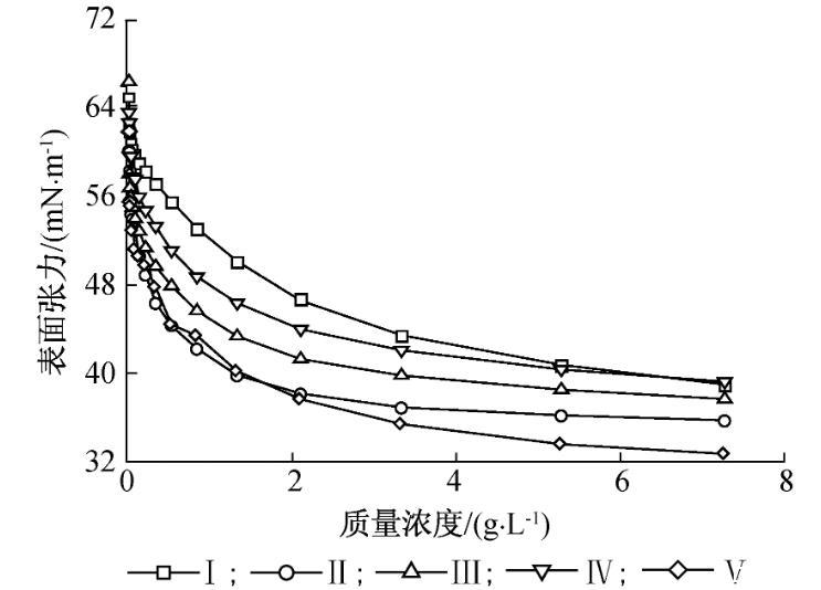 由表1可知,5種高分子表面活性劑的重均相對(duì)分子質(zhì)量在1 643~5 267之間,萜烯馬來酸酐與聚乙二醇2 000反應(yīng)得到的表面活性劑重均相對(duì)分子質(zhì)量最大,表面活性劑的聚合度隨著聚乙二醇相對(duì)分子質(zhì)量的增大呈先增大后減小的趨勢,化合物Ⅱ聚合度最大,為4.9。