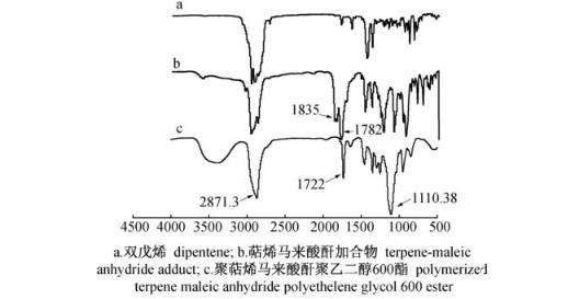 工業(yè)雙戊烯中除了百分之十左右的α-松油烯具有共軛雙鍵能直接與馬來酸酐發(fā)生D-A加成反應(yīng)外,γ-松油烯、雙戊烯等均需在催化劑作用下發(fā)生異構(gòu)化,轉(zhuǎn)化為以α-松油烯為主的含有共軛雙鍵的單環(huán)單萜才能與馬來酸酐發(fā)生反應(yīng)生成萜烯馬來酸酐加合物,萜烯馬來酸酐加合物再分別與聚乙二醇(400,600,1 000,2 000,4 000)進(jìn)行反應(yīng)得到對(duì)應(yīng)的目標(biāo)產(chǎn)物,分別為聚萜烯馬來酸酐聚乙二醇400酯(Ⅰ),聚萜烯馬來酸酐聚乙二醇600酯(Ⅱ),聚萜烯馬來酸酐聚乙二醇1000酯(Ⅲ),聚萜烯馬來酸酐聚乙二醇2000酯(Ⅳ)和聚萜烯馬來酸酐聚乙二醇4000酯(Ⅴ)。