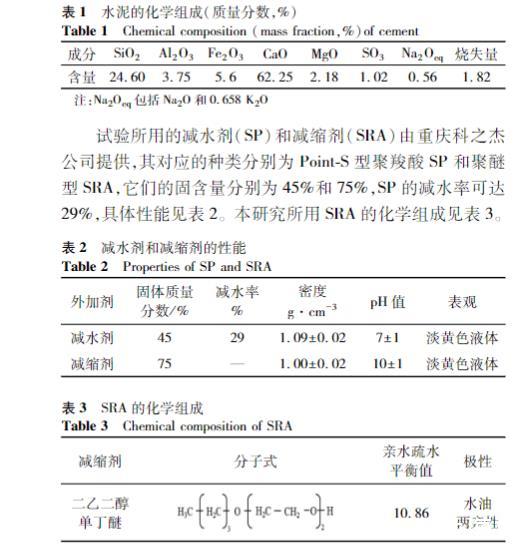 試驗(yàn)所用的減水劑(SP)和減縮劑(SRA)由重慶科之杰公司提供,其對(duì)應(yīng)的種類分別為PointS型聚羧酸SP和聚醚型SRA,它們的固含量分別為45%和75%,SP的減水率可達(dá)29%,具體性能見表2.本研究所用SRA的化學(xué)組成見表3.