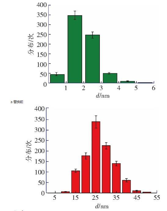 納米氣泡的高度在8~20 nm范圍之內(nèi),直徑在100~500 nm范圍之內(nèi),圖3c為圖3b中典型納米氣泡的截面圖。掃描得到納米氣泡圖像以后,在該表面上進(jìn)行力曲線測(cè)量實(shí)驗(yàn),如圖2b所示。所有離曲線的‘跳進(jìn)’距離均大于10 nm且是變化的,同時(shí),由雙電層引起的斥力也消失了,不符合DLVO理論。這種‘跳進(jìn)’距離不同的長(zhǎng)程力應(yīng)該是因?yàn)榇?水替換后HOPG表面上生成的納米氣泡造成的。圖3b中納米氣泡的覆蓋率約為21.8%,在該表面不同位置測(cè)量得到的力曲線必然會(huì)存在探針-HOPG相互作用的情況,即不都是探針-氣泡的相互作用的情況。然而,根據(jù)醇-水替換前后多次測(cè)量力曲線得到“跳進(jìn)”距離d的統(tǒng)計(jì)分析(圖4a和圖4b),醇-水替換前測(cè)量得到的力曲線的“跳進(jìn)”距離大部分都小于5 nm(99%),而醇-水替換后測(cè)得的力曲線的“跳進(jìn)”距離均大于10 nm。這表明,醇-水替換后即使不是探針-氣泡相互作用的情況下,探針與HOPG表面的相互作用時(shí)仍然存在長(zhǎng)程引力,而這應(yīng)該是IGE造成的。該研究結(jié)果與Peng等人的研究結(jié)果一致,驗(yàn)證了Limbeek對(duì)IGE與納米氣泡共存的假設(shè)。