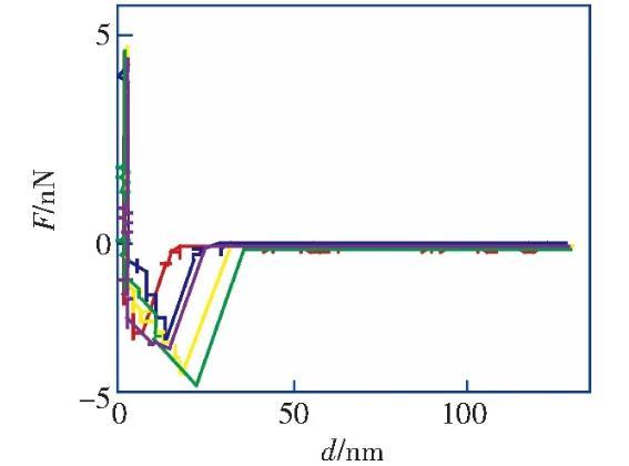 筆者利用原子力顯微鏡實(shí)驗(yàn)測(cè)量了HOPG表面在醇-水替換前后的力距離曲線,發(fā)現(xiàn)醇-水替換前進(jìn)針曲線的跳進(jìn)距離小于5 nm,滿(mǎn)足DLVO理論;而在醇-水替換后納米氣泡覆蓋率為21.8%的情況下,進(jìn)針曲線的跳進(jìn)距離均大于10 nm,不能再用DLVO理論解釋?zhuān)C明了IGE與納米氣泡共存這一現(xiàn)象。根據(jù)改進(jìn)的Laplace-Young方程,結(jié)合文獻(xiàn)中對(duì)納米氣泡線張力值的計(jì)算結(jié)果,分析負(fù)的線張力對(duì)過(guò)渡區(qū)內(nèi)局部表面張力及局部固-液界面的影響,導(dǎo)致納米氣泡的接觸角反常小的原因之一。分析并討論雜質(zhì)對(duì)納米氣泡接觸角的影響,指出IGE與納米氣泡共存、線張力及雜質(zhì)影響的共同作用是導(dǎo)致納米氣泡接觸角“反常小”的原因。