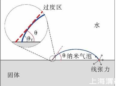 研究發(fā)現(xiàn)線張力對(duì)納米氣泡接觸角的影響是不可忽視的。線張力是指單位長(zhǎng)度上三相接觸線過(guò)剩的自由能。這種過(guò)剩自由能的來(lái)源有兩種:一是由于表面力的存在致使過(guò)渡區(qū)內(nèi)局部的界面變形產(chǎn)生的;另一個(gè)是過(guò)渡區(qū)內(nèi)不飽和分子間的相互作用所使界面張力產(chǎn)生的局部變化。圖5是過(guò)渡區(qū)內(nèi)由于線張力的影響導(dǎo)致納米氣泡的納觀接觸角低于宏觀接觸角的示意。
