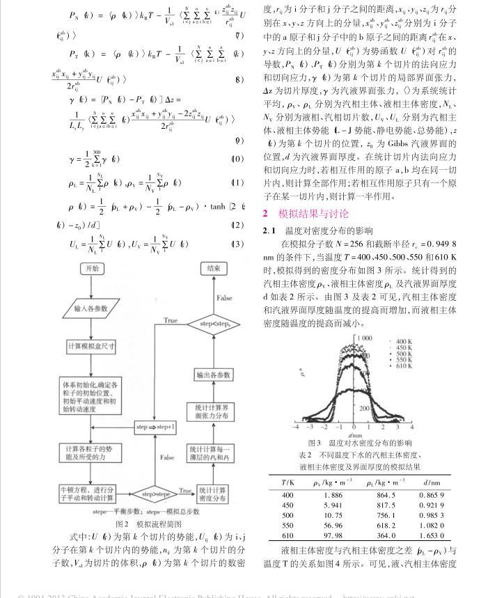 在模擬過程中,對(duì)物理量進(jìn)行無量綱化處理;x、y、z三個(gè)方向均采用周期性邊界條件;保證系統(tǒng)的體積V、溫度T和模擬分子數(shù)N保持不變,采用Woodcock變標(biāo)度恒溫法實(shí)現(xiàn)系統(tǒng)恒溫;不斷對(duì)體系質(zhì)心進(jìn)行矯正,使之處于坐標(biāo)原點(diǎn);將模擬盒子沿z方向劃分為300個(gè)等厚度的薄片;模擬時(shí)間步長為0.8fs,總模擬步數(shù)為60萬步,其中前20萬步用于使系統(tǒng)達(dá)到平衡,后40萬步用于統(tǒng)計(jì)界面特性參數(shù)。