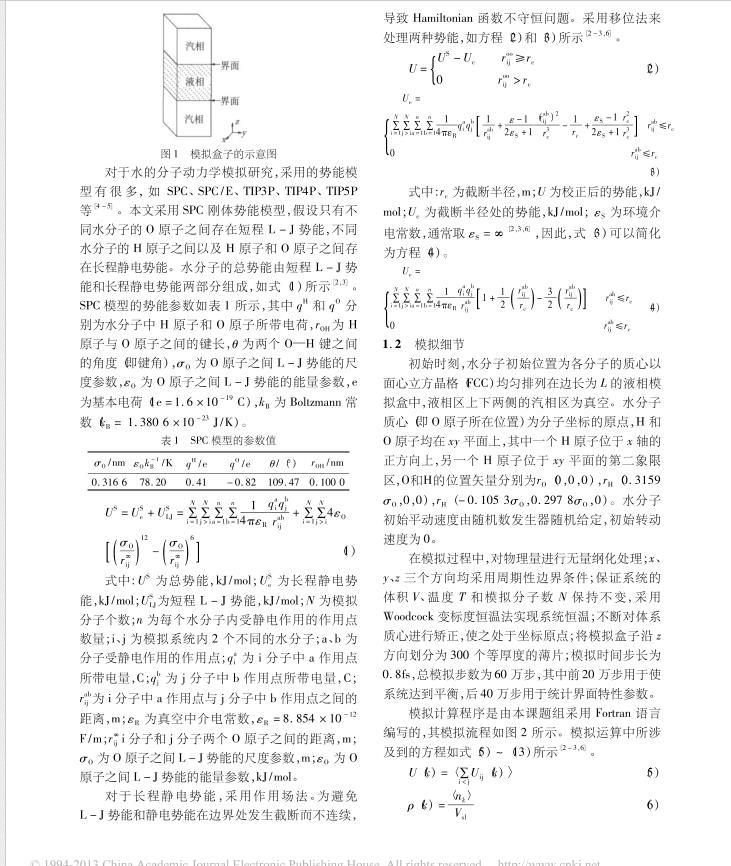 水是許多化學(xué)反應(yīng)過程廉價(jià)的反應(yīng)溶劑,也是化工生產(chǎn)過程常用的工質(zhì)。汽液界面行為是研究水相變傳熱問題的基礎(chǔ)。目前,工程上許多有關(guān)水蒸發(fā)、水蒸氣冷凝、加熱干燥等相變傳熱數(shù)據(jù)仍主要依賴于實(shí)驗(yàn)。隨著分子模擬技術(shù)的發(fā)展,采用分子動(dòng)力學(xué)模擬方法,從分子水平揭示水汽液界面特性的研究,引起了國內(nèi)外許多學(xué)者的極大關(guān)注。本文擬采用SPC模型,對(duì)水汽液界面特性進(jìn)行平衡分子動(dòng)力學(xué)模擬研究,探討溫度、截?cái)喟霃?、模擬分子數(shù)對(duì)水汽液界面特性的影響規(guī)律。
