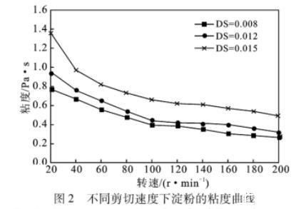 粘度是反映液體流變性能最常用的指標(biāo),粘度越小其流變性越高。由圖2可知,在同一轉(zhuǎn)速下,隨著取代度的增加,棕櫚酸酯淀粉糊液粘度升高;隨轉(zhuǎn)速增大,粘度先急劇下降后逐漸趨向平緩。棕櫚酸酯淀粉糊液粘度隨剪切速率的增大而減小,呈現(xiàn)“剪切稀化”特性,屬假塑性流體。淀粉糊液“剪切稀化”的程度與分子鏈的長短有關(guān),高DS淀粉酯相對(duì)分子質(zhì)量較高,“剪切稀化”程度也較大。淀粉糊液表觀粘度隨著剪切速率的增大而降低,表明淀粉凝膠網(wǎng)絡(luò)體系中分子間或分子內(nèi)的作用力(氫鍵)在較高的剪切速率下更容易被破壞。當(dāng)剪切速率繼續(xù)增加到淀粉分子纏結(jié)點(diǎn)、范德華力作用點(diǎn)被破壞完全來不及重建時(shí),淀粉糊液表觀粘度趨于最小值。