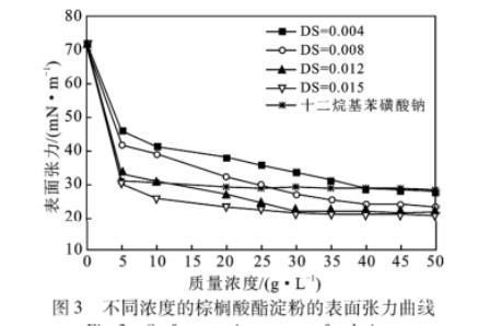 不同DS不同質(zhì)量濃度的棕櫚酸酯淀粉具有不同的表面張力,DS越高、質(zhì)量濃度越大,其表面張力越低,DS越高的淀粉其表面張力趨于穩(wěn)定的濃度越低,即臨界膠束濃度(cmc)越低。臨界膠束濃度(cmc)是表面活性劑的重要特征參數(shù),cmc越低的表面活性劑的效率越高。實(shí)驗(yàn)范圍內(nèi)的棕櫚酸酯淀粉具有較高的表面活性,可作為表面活性劑應(yīng)用。