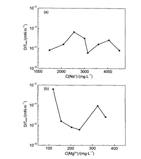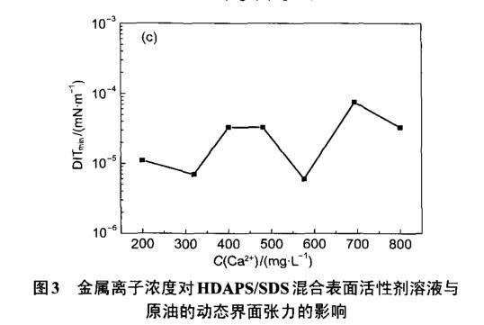 圖3金屬離子濃度對HDAPS/SDS混合表面活性劑溶液與原油的動態(tài)界面張力的影響