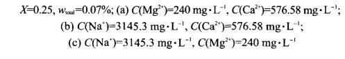 配制溶液所用的是高礦化度且含有高濃度二價金屬離子的模擬礦化水,從上面的實驗結(jié)果中看出,HDAPS/SDS混合體系在高鹽條件下可以與原油達(dá)到超低界面張力??紤]到在實際應(yīng)用過程中地層水的礦化度可能發(fā)生變化,恒定模擬水中Na+、Mg2+和Ca2+中兩種金屬離子的濃度,考察了Na+、Mg2+和Ca2+濃度變化對HDAPS/SDS混合體系與原油界面張力的影響,實驗結(jié)果如圖3所示。從圖中可以看出,模擬水中Na+濃度在1500-4500 mg·L-1、Mg2+濃度在120-360 mg·L-1和Ca2+濃度在200-800 mg·L-1范圍內(nèi)變化時,HDAPS/SDS混合體系與原油的界面張力均可達(dá)到超低界面張力,這說明在高礦化度和高濃度二價金屬離子條件下,HDAPS/SDS混合體系也表現(xiàn)出非常優(yōu)異的界面活性。