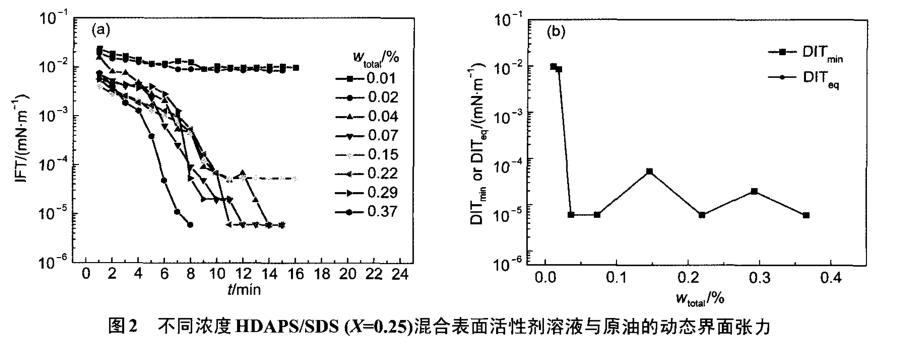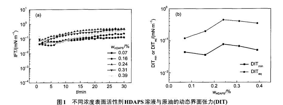 圖1不同濃度表面活性劑HDAPS溶液與原油的動態(tài)界面張力(DIT)